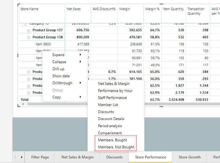 Both of these report pages are hidden but can be drilled to from any item displayed in other reports, to a list of members that have bought and not bought the item.