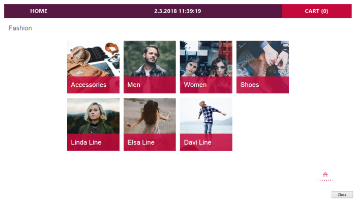 - When you have logged into the terminal, press the Shop button in the top left corner. This opens the Clienteling brick view in a browser control. The Brick categories are retrieved from the Hierarchy setup in LS Central (see Hierarchies in the LS Central Help for more information).