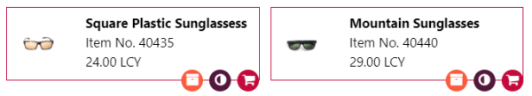 The Product Compare feature is used to compare two items and the attributes assigned to them. To compare, click the Compare icon on the items that you want to compare. This sends the items to a small panel at the bottom of the brick view. There you can clear the items from the compare selection or click Compare to open the Compare panel.