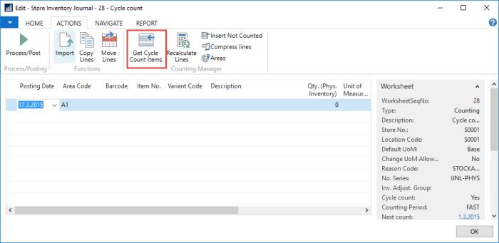 In order to perform a Cycle count, Cycle Count items must be setup and the Physical Inventory Counting Period must be linked to the Store Inventory Worksheet. The count is then limited to the items that are included in the same Physical Inventory Counting Period. For Normal count, all items are in the loop.