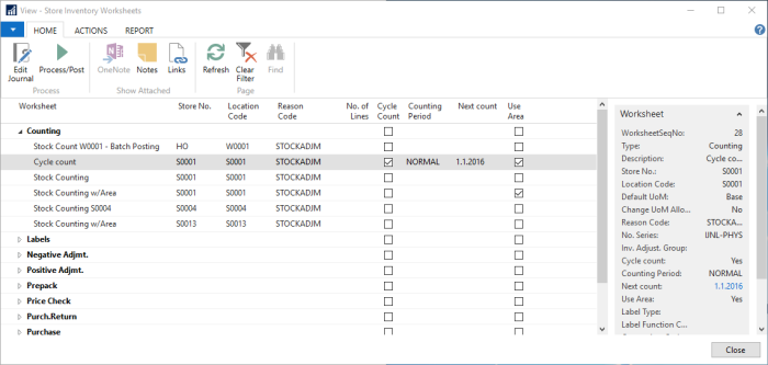 When all items have been counted and accepted, posting the worksheet journal with the Process/Post action will adjust the inventory. Processed lines are removed from the journal.