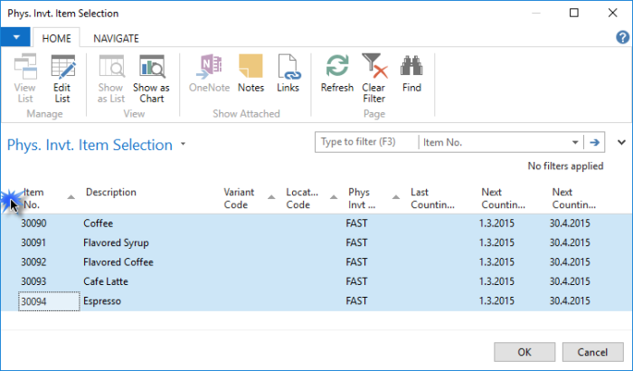 Note: You can set filters to find items to count, but remember to select all lines before you click OK, because only selected lines are created in the worksheet journal.