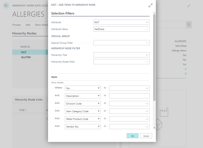 1. You can add other filters and they will be added to the Attribute filters. For example, if you only want items from the DESSERTS item category, you can enter DESSERT in the Item Category Codefilter field on the Item FastTab, and only Items with Item Category Code = DESSERT that have Attribute NUT with Yes or Trace will be added to the node.