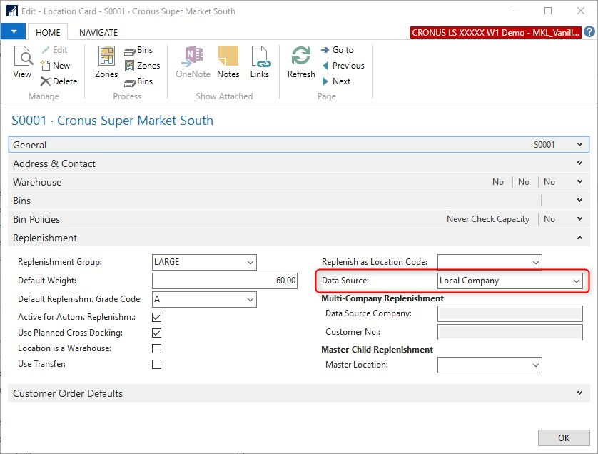A location with this setup will not calculate stock and demand in the current company, but copy the calculated values from the set up Data Source Company.